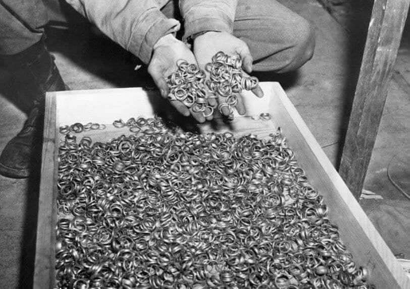 ﻫﺮ ﺳﺮﺑﺎﺯﯼ ﺩﺭ ﺟﯿﺐﻫﺎﯾﺶ، ﺩﺭ ﻣﻮﻫﺎﯾﺶ ﻭ ﻻﯼ ﺩﮐﻤﻪﻫﺎﯼ ﯾﻮﻧﯿﻔﻮﺭﻣﺶ ﺯﻧﯽ ﺭﺍ ﺑﻪ میدان ﺟﻨﮓ میبرد. ﺁﻣﺎﺭ ﮐﺸﺘﻪﻫﺎﯼ ﺟﻨﮓ ﻫﻤﯿﺸﻪ ﻏﻠﻂ ﺑﻮﺩه ﺍﺳﺖ.. (حلقه های ازدواج به جای مانده از جنگ جهانی دوم)
