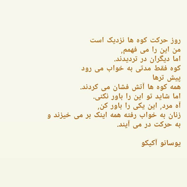 _«روز شماری مکن. حتی اگر فکر میکنی در مهلکه افتادهای روز شماری مکن! حالا هم لحظه شماری مکن! شب نمیتواند تمام نشود. طبیعت شب آن است که برود رو به صبح. نمیتواند یک جا بماند. مجبور است بگذرد. اما وقتی تو ذهنت را اسیر گذر لحظهها کنی، خودت گذر لحظهها را سنگین و سنگینتر میکنی؛ بگذار شب هم راه خودش را برود.»