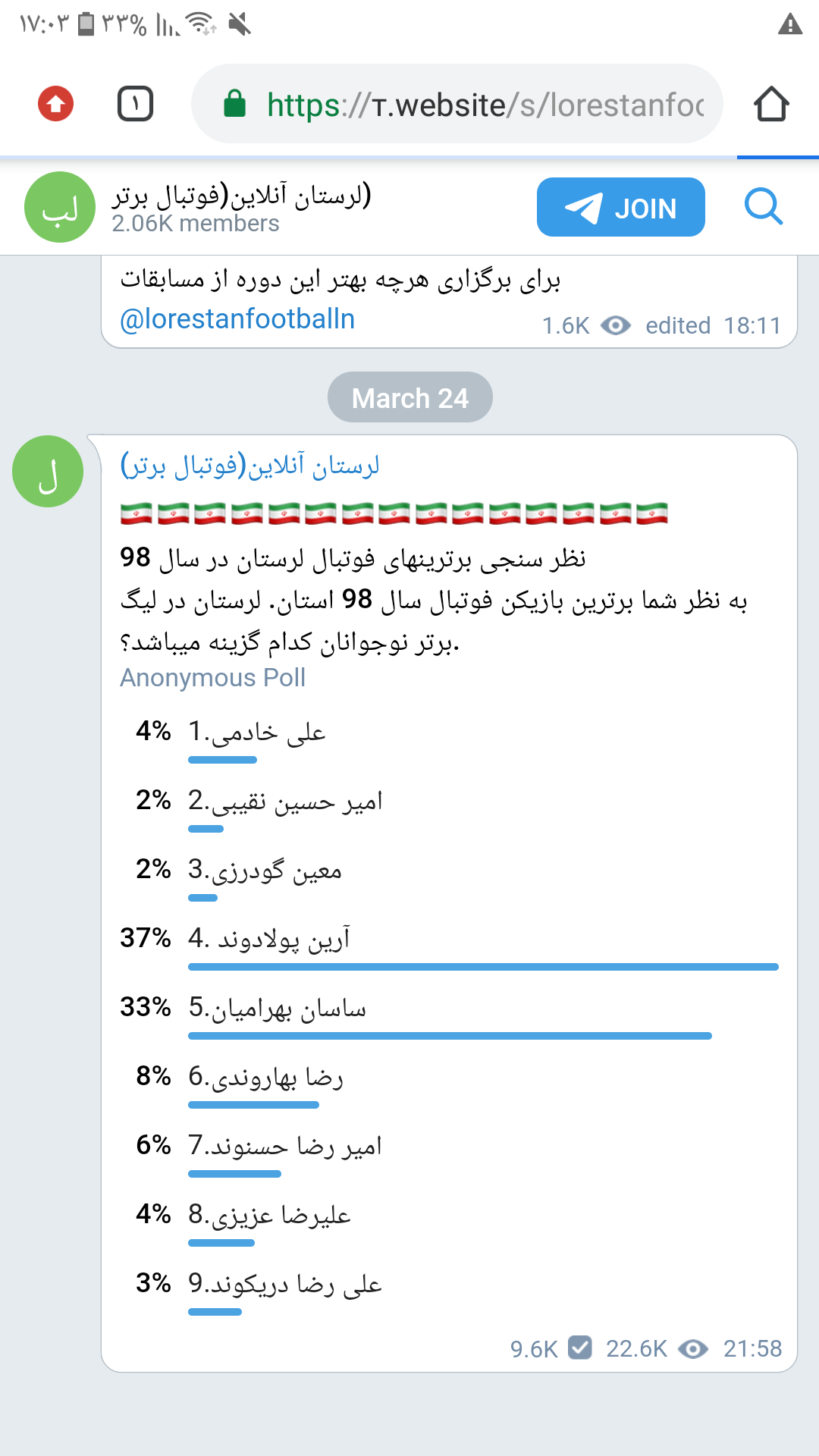 @lorestanfootballnکپی کنیدواردکانال تلگرام بشید...بیزحمت به علی خادمی رای بدیدفوتبالیسته تونظــرسنجی سپاس پسرداییمه...تشڪـــر
