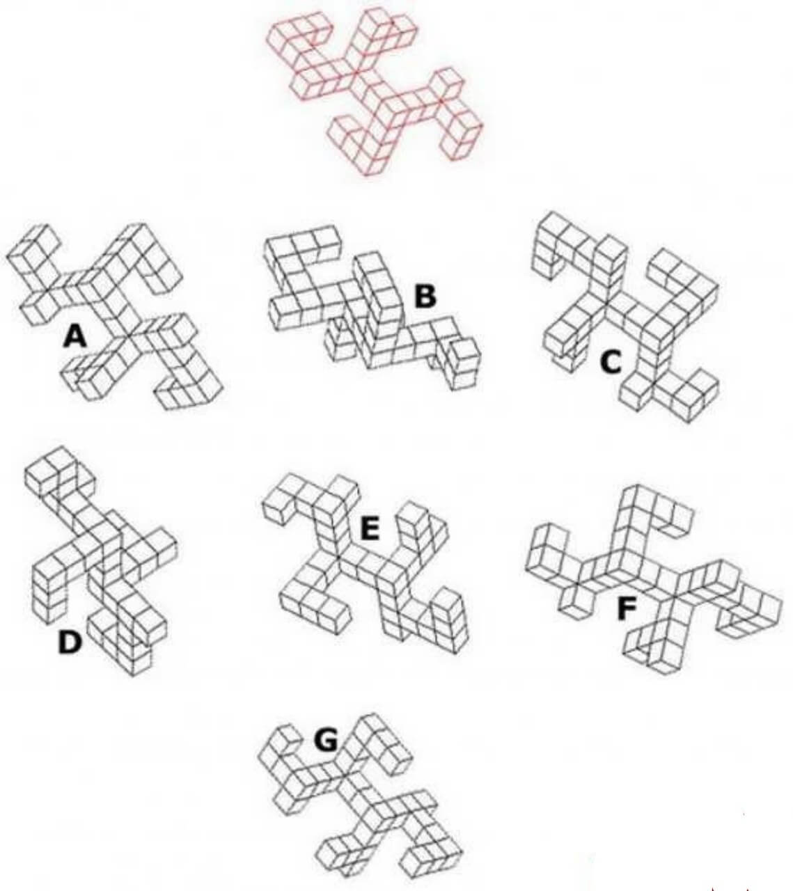 رنگ قرمز به عنوان مرجع در این معمای تصویری در نظر گرفته می شود، هدف از این معما هم این است که از بین سایر گزینه ها کدام یک با طرح قرمز کاملا شباهت دارد؟کووووش تصویر