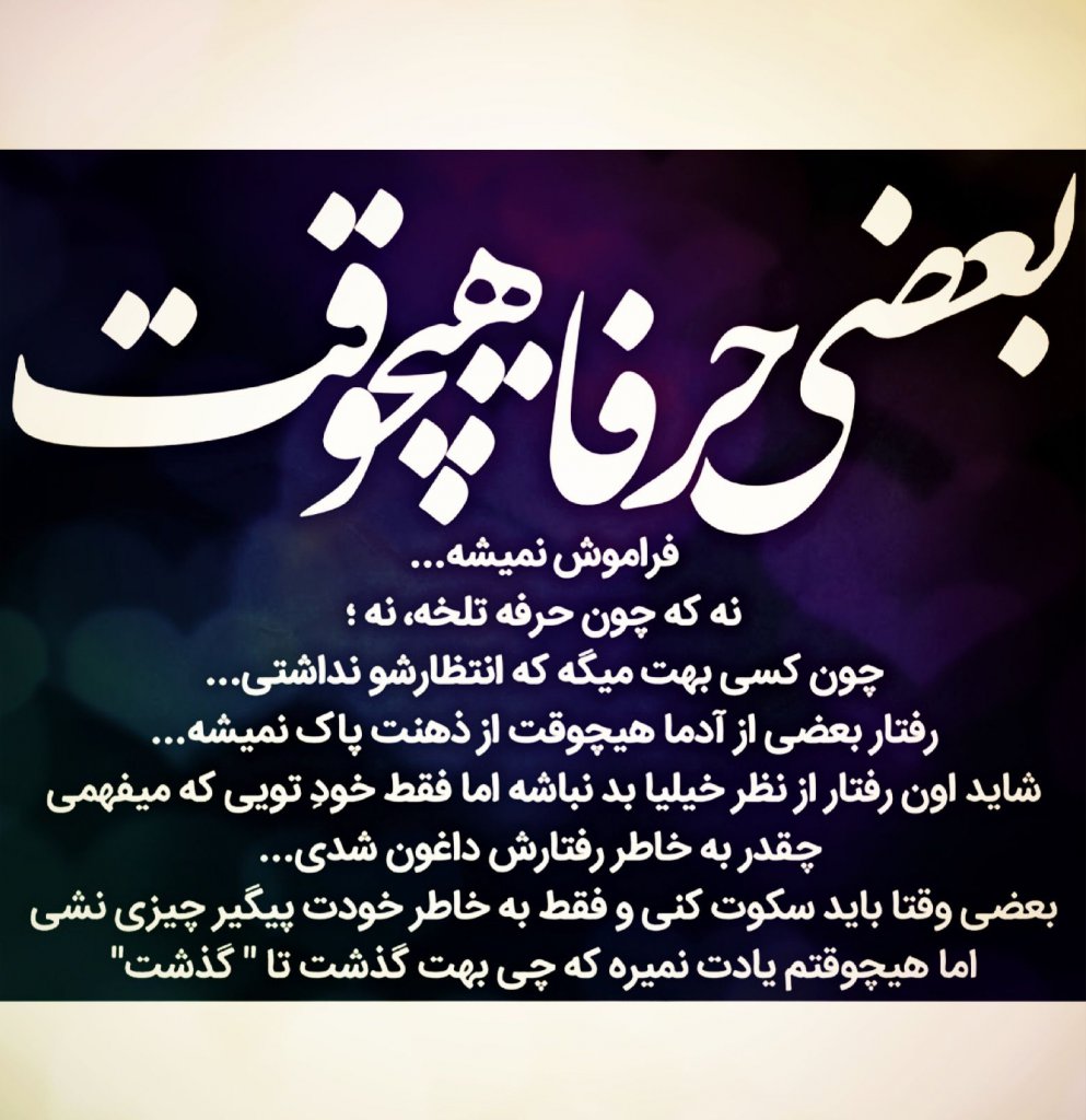 بعضی حرفا هیچوقت فراموش نمیشه... نه که چون حرفه تلخه، نه؛ چون کسی بهت میگه که انتظارشو نداشتی... رفتار بعضی از ٱدما هیچوقت از ذهنت پاک نمیشه ... شاید اون رفتار از نظر خیلیا بد نباشه اما فقط خود تویی که میفهمی چقدر به خاطر رفتارش داغون شدی... بعضی وقتا باید سکوت کنی فقط بخاطر خودت پیگیر چیزی نشی اما هیچوقتم یادت نمیره که چی بهت گذشت تا "گذشت"