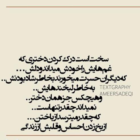 بعضی حرفا هیچوقت فراموش نمیشه... نه که چون حرفه تلخه، نه؛ چون کسی بهت میگه که انتظارشو نداشتی... رفتار بعضی از ٱدما هیچوقت از ذهنت پاک نمیشه ... شاید اون رفتار از نظر خیلیا بد نباشه اما فقط خود تویی که میفهمی چقدر به خاطر رفتارش داغون شدی... بعضی وقتا باید سکوت کنی فقط بخاطر خودت پیگیر چیزی نشی اما هیچوقتم یادت نمیره که چی بهت گذشت تا "گذشت"